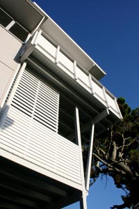 Original Bribie beach cottages were the inspiration for the building character with fibro and batten wall panels, corrugated iron roofs and wall cladding, timber decks, window hoods and casement windows evident throughout.