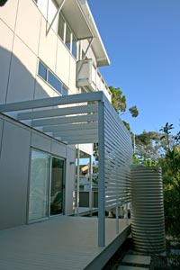Timber decks occur at each level and a separate living space at the ground floor level for guests opens onto landscaped courtyards.