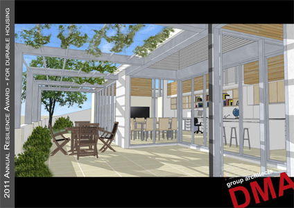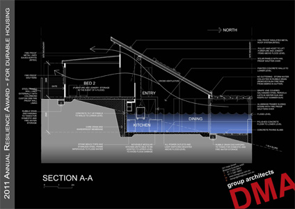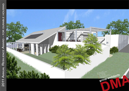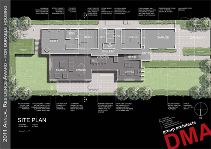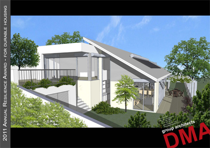 After the natural disasters that hit Australia in 2011 the Insurance Council of Australia sponsored an ideas competition for a house design that was resilient to flood, bushfire, cyclone and hail attack on a hypothetical site with a challenging 1:4 slope.