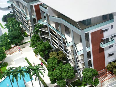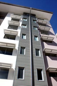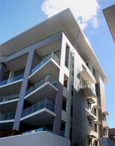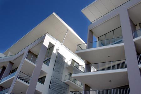 The built forms are layered to visually reduce building scale.The horizontal form of the cantilevered balconies is contained within a strongly expressed framework that floats above the base layer.