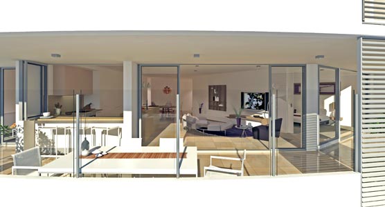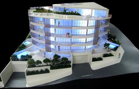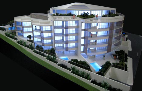 The stepped, curved and fan shaped structure is a response to the site conditions and all apartments have superb ocean views.