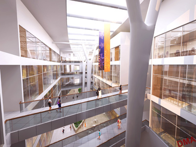 This form of building also has practical benefits allowing fast erection of the external skin to enable construction during the severe winter weather. The atrium and voids induce vertical air movement and coupled with opening windows and skylight air extraction vents, the heating and cooling requirements will be reduced considerably.