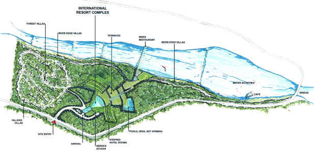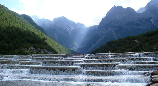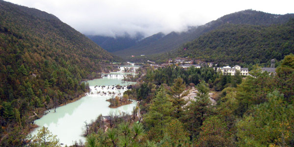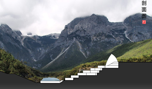 A new resort complex replacing an obsolete tourist hotel on the Jade Dragon river below the world famous Snow Mountain near Lijiang in south western China.