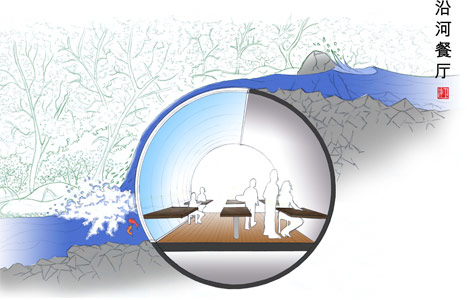 Most of the buildings are underground structures opening onto stone terraces stepping down to the river bank with glazed elements piercing the surface only. The built forms are reminiscent of the terraced agricultural land forms that have existed for thousands of years in this part of the world.